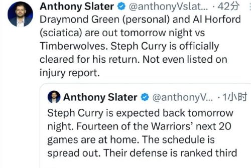 勇士伤病报告:库里伤停5场后复出战森林狼 追梦霍福德缺席