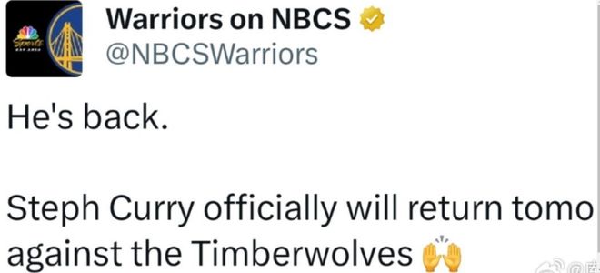 如今库里将在对阵森林狼的比赛迎来复出,他已经从球队的伤病名单消失。库里对于自己的状态表示:“我现在感觉非常好,对于明天出战比赛,我相当乐观。”